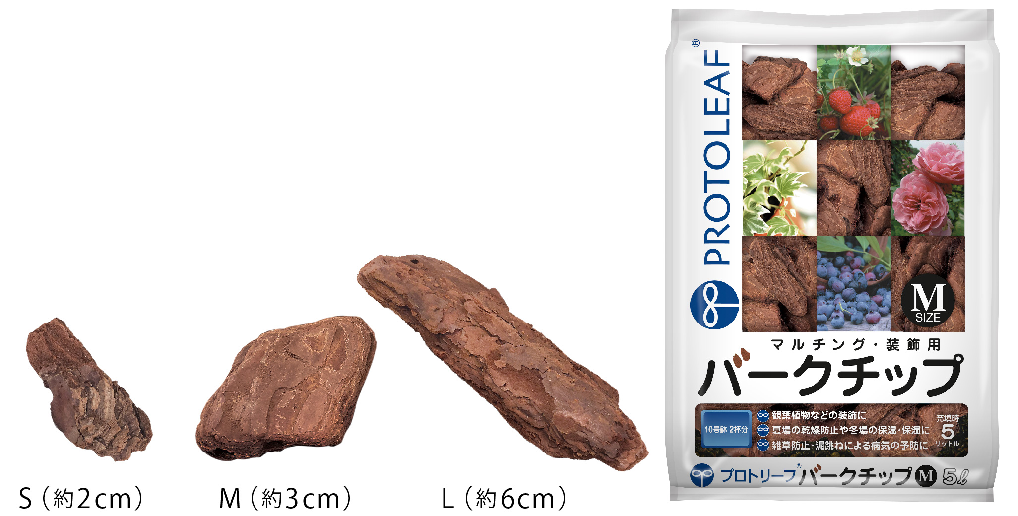 軽くて取り扱いやすいので、袋を開けたらまくだけ、そんなお手軽さも魅力です。鉢植えやプランターのカバー材として使うなら、SまたはMサイズが2Lぐらいあれば十分です。お庭で使う場合は、Mサイズで10L以上の大袋がお得です。このように、バークチップには商品としてたくさんの種類があり、目的に合わせて選ぶことができるのもうれしいポイントのひとつです。