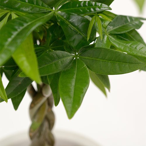 パキラは卓上サイズのミニ観葉植物としておなじみで、サイズはほかにも中型・大型と幅広そろく揃っています。手のひらを開いたような可愛らしい5枚の葉には緑一色のものと斑入りのものがあります。