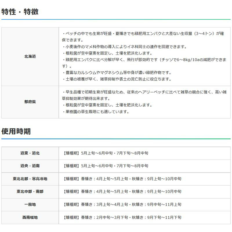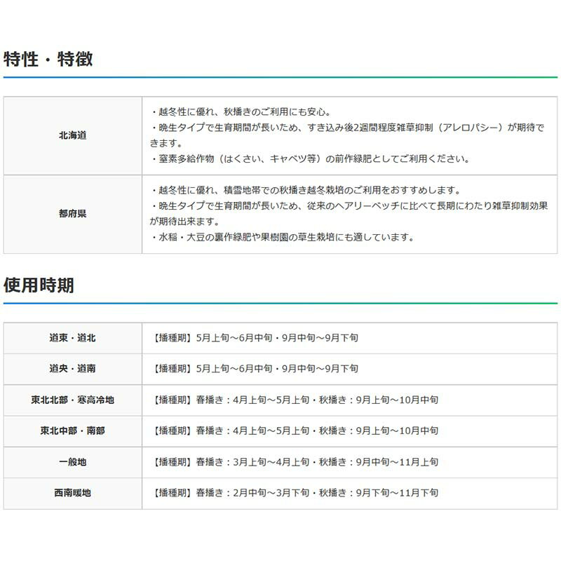 寒太郎は湿気と冬の寒さに強いため、雪が積もる寒い地域での秋まきに適しています。特に北海道のような極寒地に適した品種です。開花が遅く生育期間が長いことから、まめ助のような従来のヘアリーベッチよりも長い期間、雑草抑制効果を発揮します。